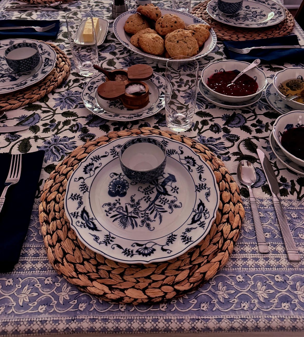 These indigo blue and white dishes were my grandmothers; ‘Blue Danube’ from Japan. They were only used for special occasions. Since receiving this china, I choose to use it as often as I can. The tea cups were my MIL’s and they go together perfectly, creating a nice boho vibe.