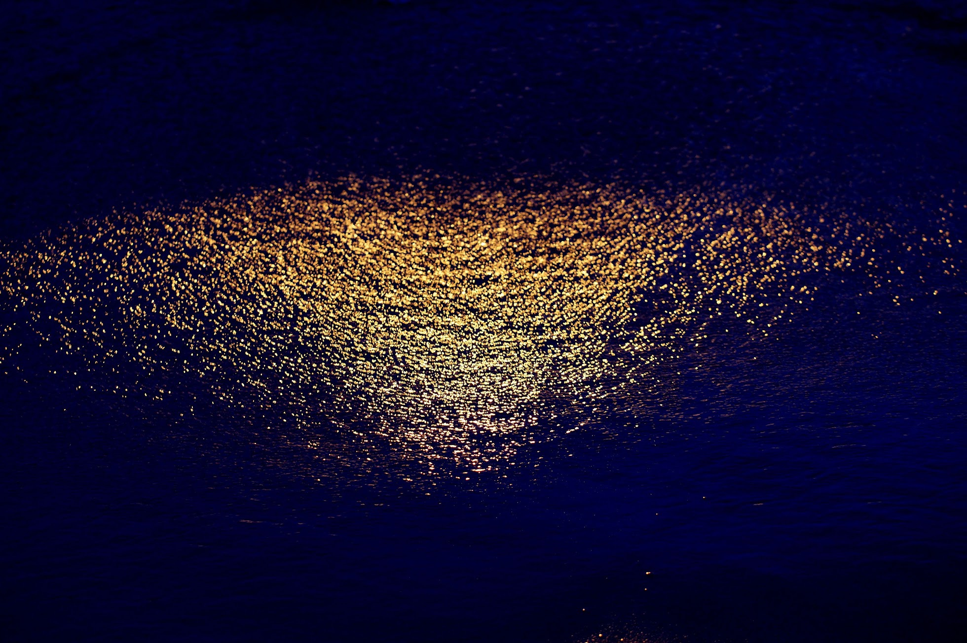 Indigo waters on the east side of Lake Michigan, in Holland “Mish.” Taken in the last moments of sunset. The reflection of the sun in the water looks like the lights of a city.