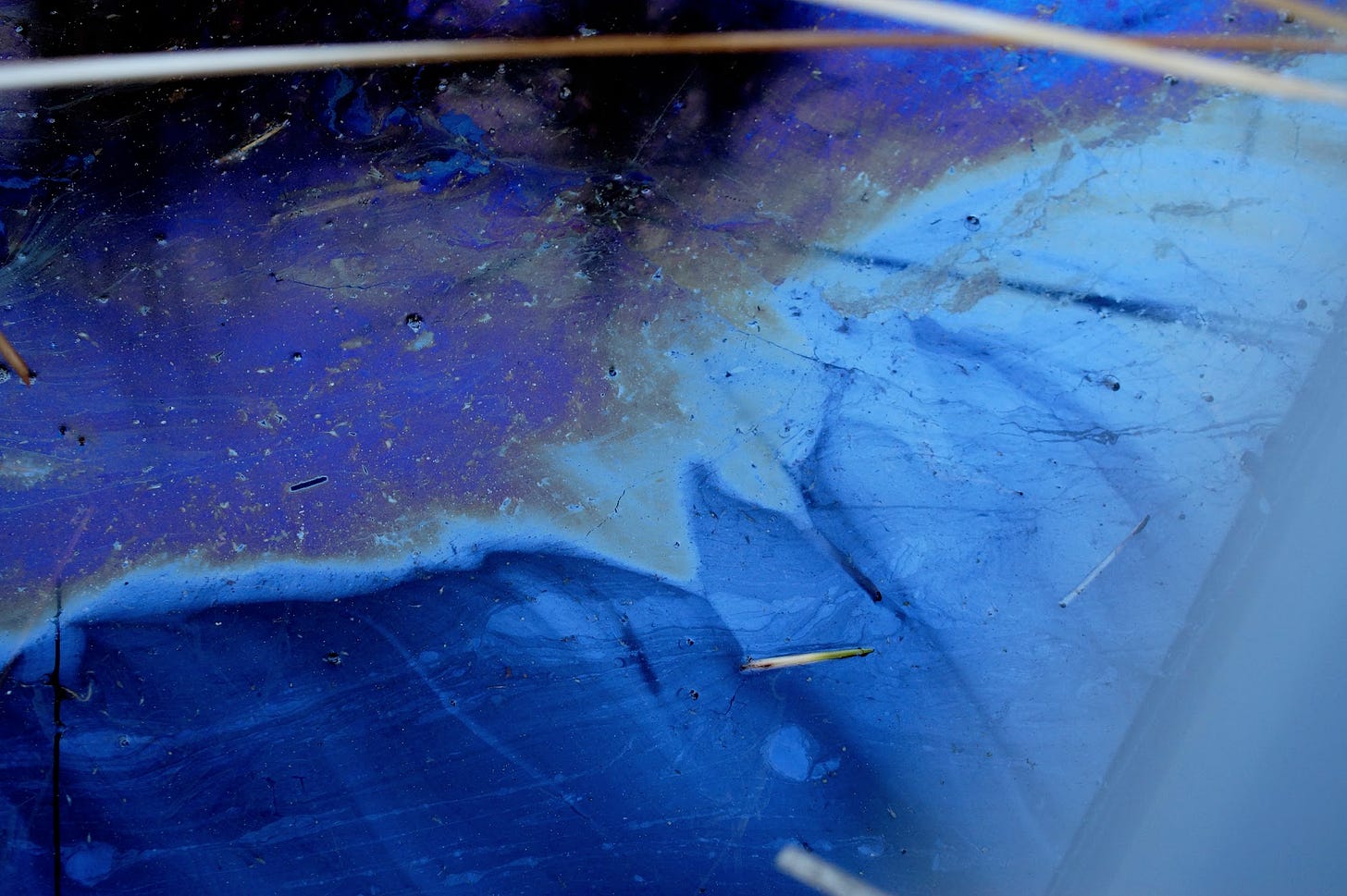 Frozen and thawing ice with indigo, purples, gold and white! There must have been oil of some sort in the water. The sun and clouds created this visual. I am always fascinated by how nature moves through the changing of the seasons and how we only witness so much of it.