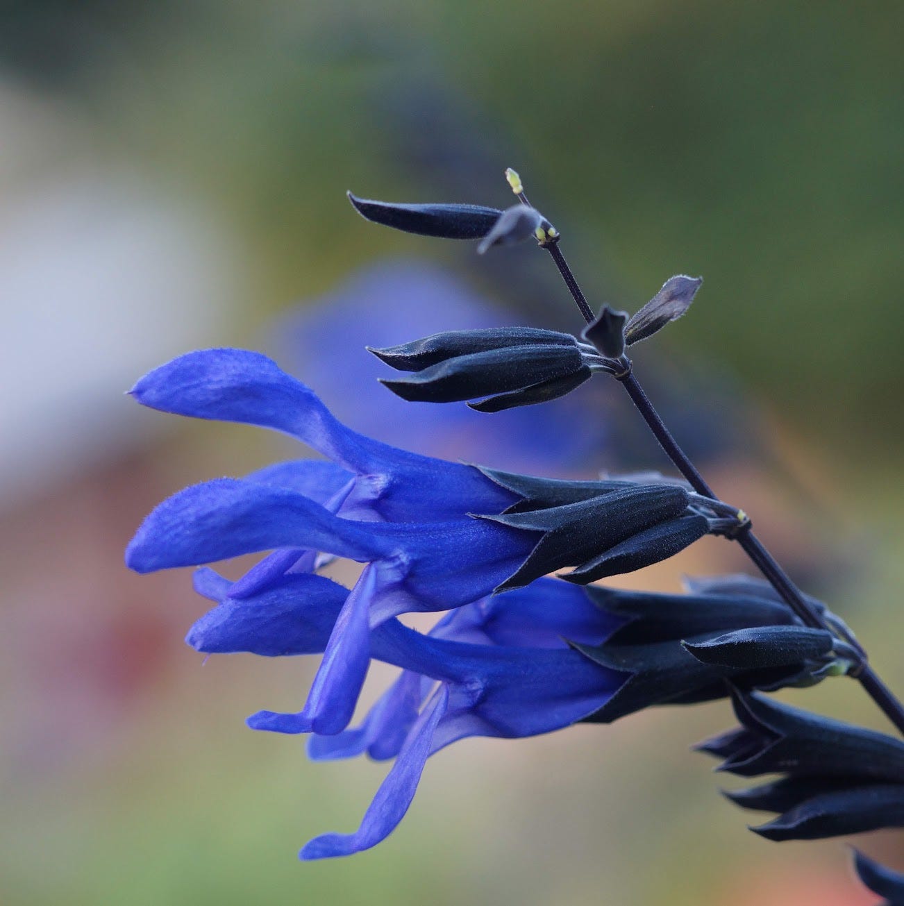 Black & Blue Salvia. If you haven’t had this annual before, and want hummingbirds to grace your presence, then this is the plant for you. The dark blue flowers come out of a darker indigo blue pod, and after the blooms come a multitude of teeny tiny seeds.