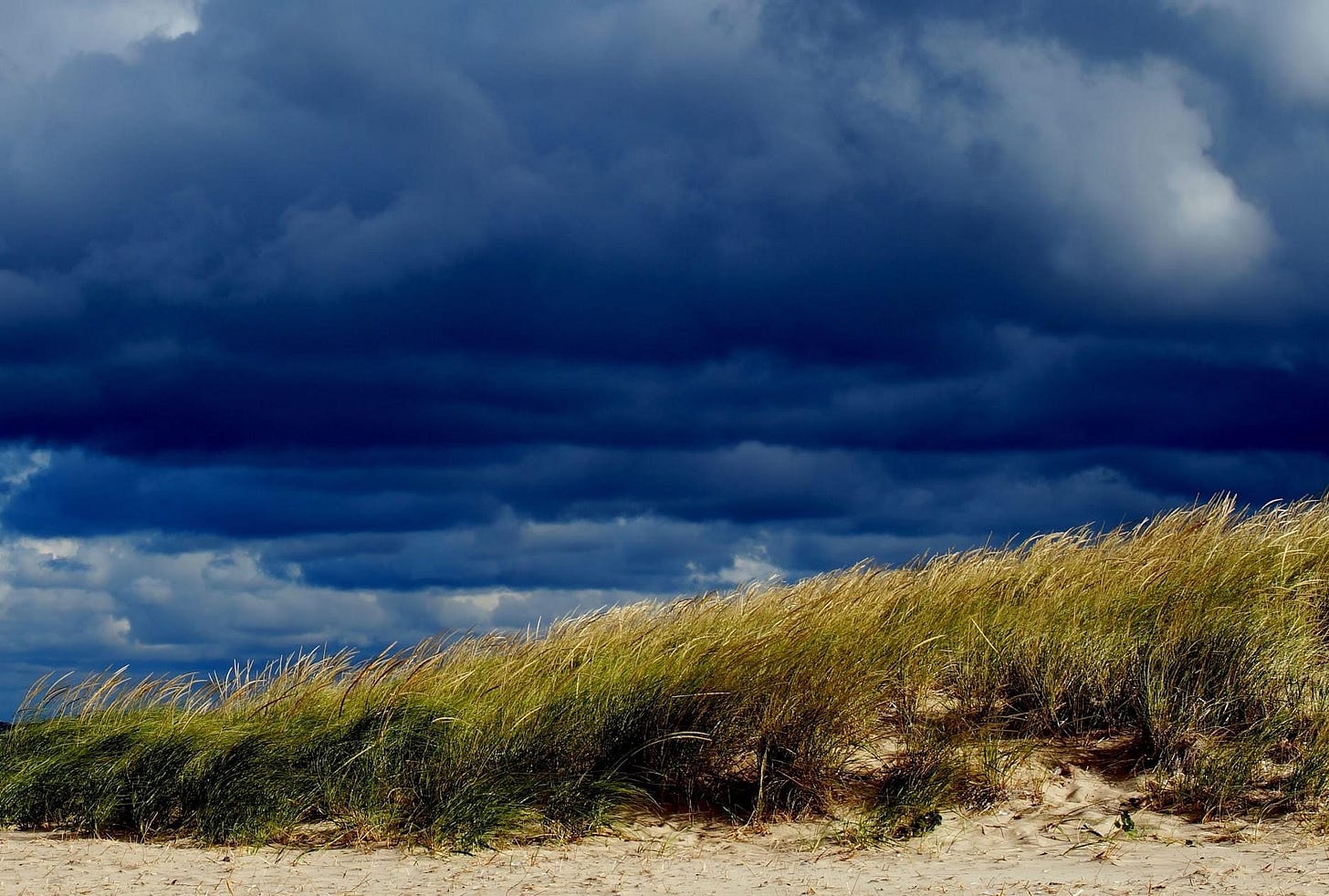 I will end with this one, another wonderful trip in Holland Mish. Yes, indigo clouds, yes blue and dark gray clouds, with the impossibly seeming sunshine across from it all. Huge gusts of wind blow off the lake, making the storm threat go away. I am standing still in the middle of it, experiencing the darkness and the light all at once. This was a powerful day, and for this experience, I was alone, but felt held by the Mother, Nature.